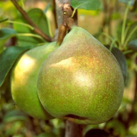 Pera de tamaño medio, color verde amarillento con chapa roja y sabor jugoso y dulce